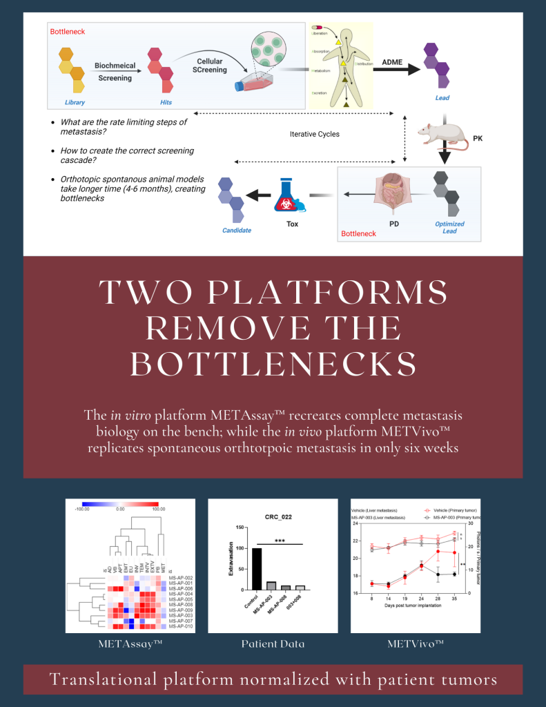 Consequently, Mestastop Solutions focuses on identification and characterisation of target compounds, comprehensive compound profiling and in-vivo pharmacology, which are reinforced by AI-powered companion diagnostics, allowing us to leverage the best cutting-edge technology to offer novel, best-in-class solutions.
